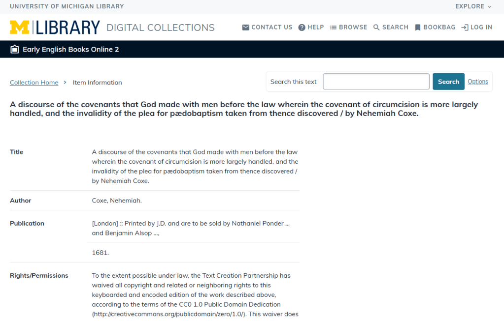 Early English Books Online: This is a go-to source for me. I’ve used it for multiple Reformed works including Particular Baptist works. Overall, very user friendly, but not great if you are looking to do word searches but it does allow you to go page by page.