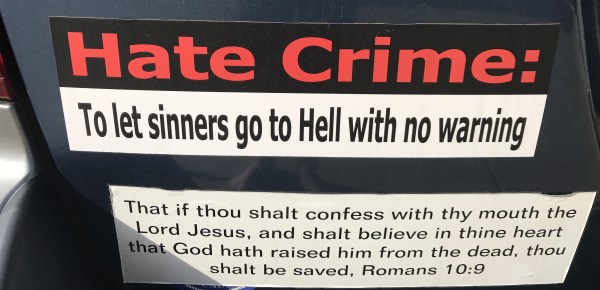 The above picture is of two bumper stickers I have on my car. The "Hate Crime" sticker is one I had custom made. The idea for the wording isn't mine; I got it from a sign that I saw a Facebook friend holding. On the surface it may seem a bit exploitive, using a charged... Continue Reading →